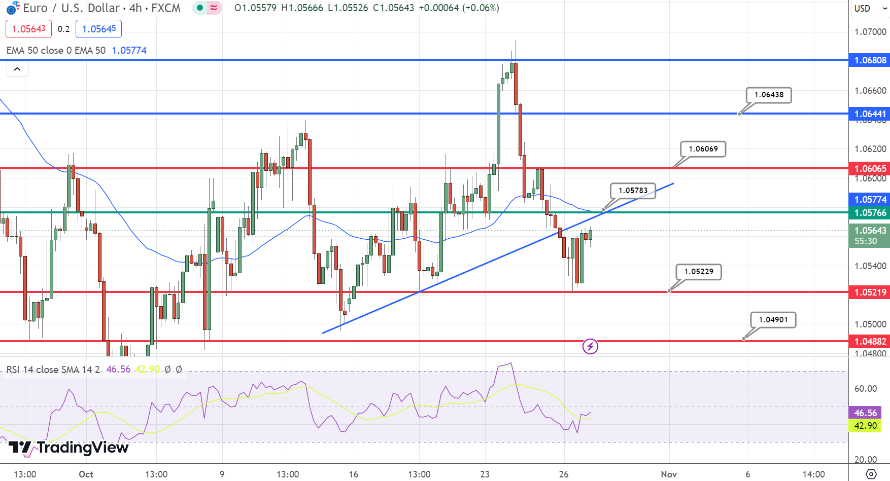 The 50-day Exponential Moving Average (EMA50) exerts a downward thrust, bolstering the anticipated bearish movement. This trajectory hinges on the currency pair’s ability to remain below the 1.0585 mark.