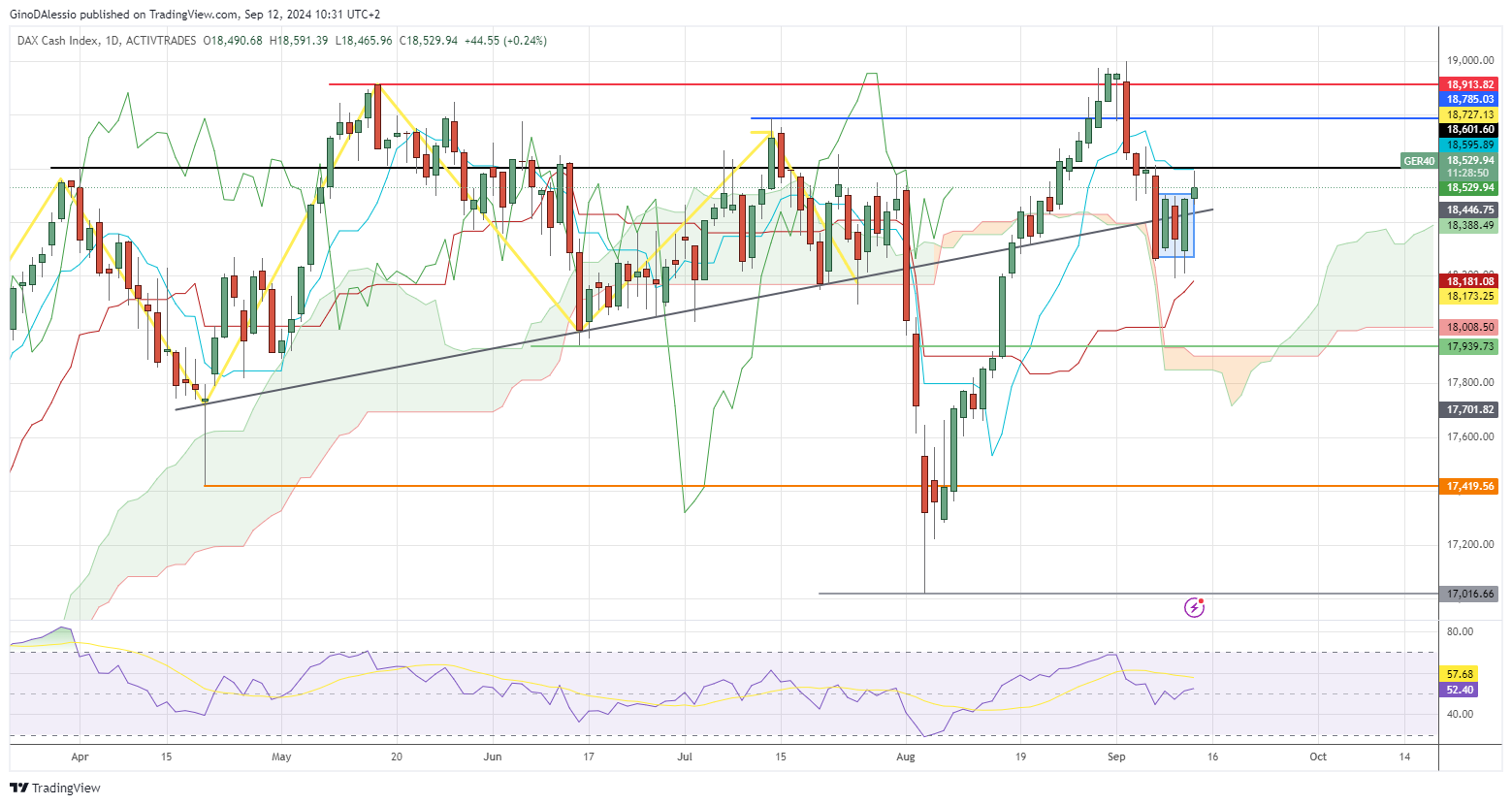To consider a consolidated bull trend, we would need to see the market close above the ATH of 18.995. The next resistance is at the previous high of 18,785 (blue line). To the downside, the support is at the cloud and the low of a previous dip of 17,939 (green line).