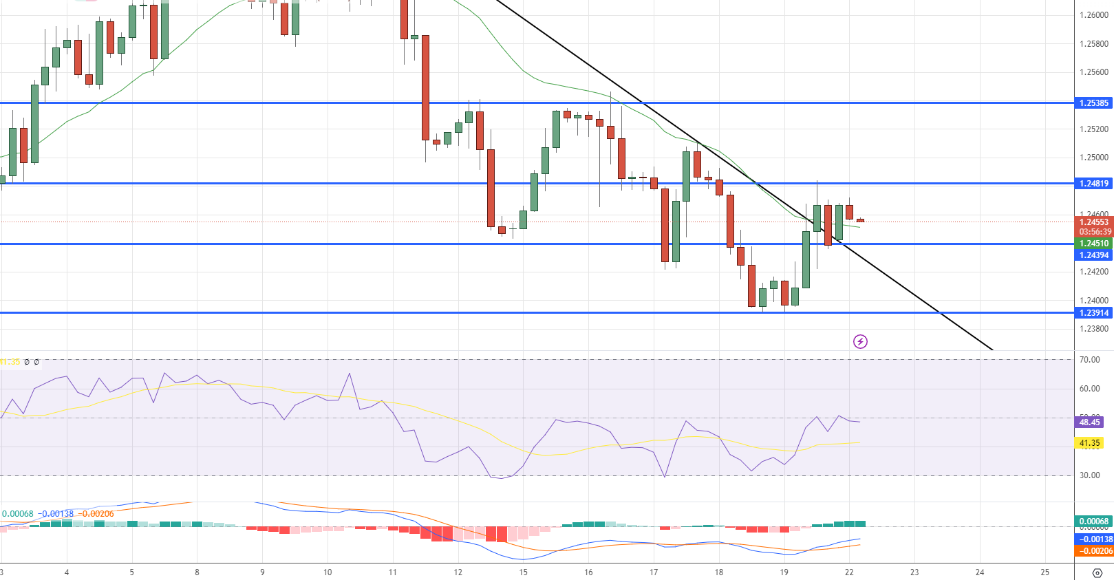 The GBP/USD pair is currently hovering above the 1.2450 level and shows potential for further gains.
