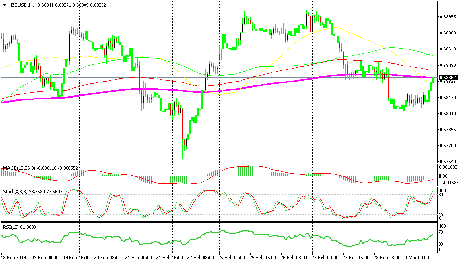NZD/USD turned bearish earlier this week as the sentiment deteriorated in financial markets. As a result, risk currencies such as commodity Dollars suffered. The trend is still bearish but during the European session we saw a 30 pip jump higher which is a retrace of the bigger downtrend, so we decided to sell this pair. The retrace ended at the 200 SMA (purple) and now a bearish reversal has began.