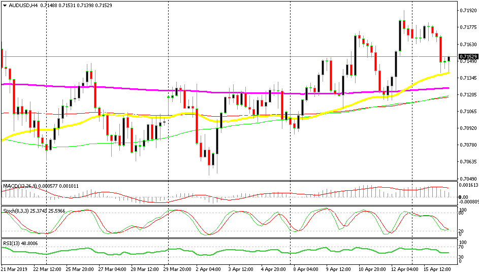 AUD/USD has been trending higher in the last two weeks and the 200 SMA (purple) turned from resistance into support last week. But this week it seems that the 50 SMA (yellow) is doing its job in providing support as this pair reversed higher from there. The price formed a doji candlestick after the pullback down and stochastic was oversold as well at that time, which was the perfect setup for a bullish reversal. The reversal higher is underway now so this pair is pretty bullish.