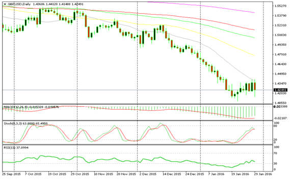The British Pound has relentlessly declined since the second week of December against the USD and many other currencies because of the Brexit referendum coming up later this year. But in the last 7-8 trading days we have seen a retrace take place. It is normal for this to happen after such ferocious decline, after all nothing goes up or down in a straight line. But as you can see after the price touched the 20 MA in the daily chart and the stochastic indicator got close to overbought levels the price moved sharply lower in the last day of January, so it is possible that the retrace has ended and the downtrend has resumed again. Either way, we saw this as an opportunity to open a sell forex signal on Thursday evening when the price was just below the 20 MA and it hit take profit the next morning. We can say that the downtrend has resumed because the lows from January are broken.