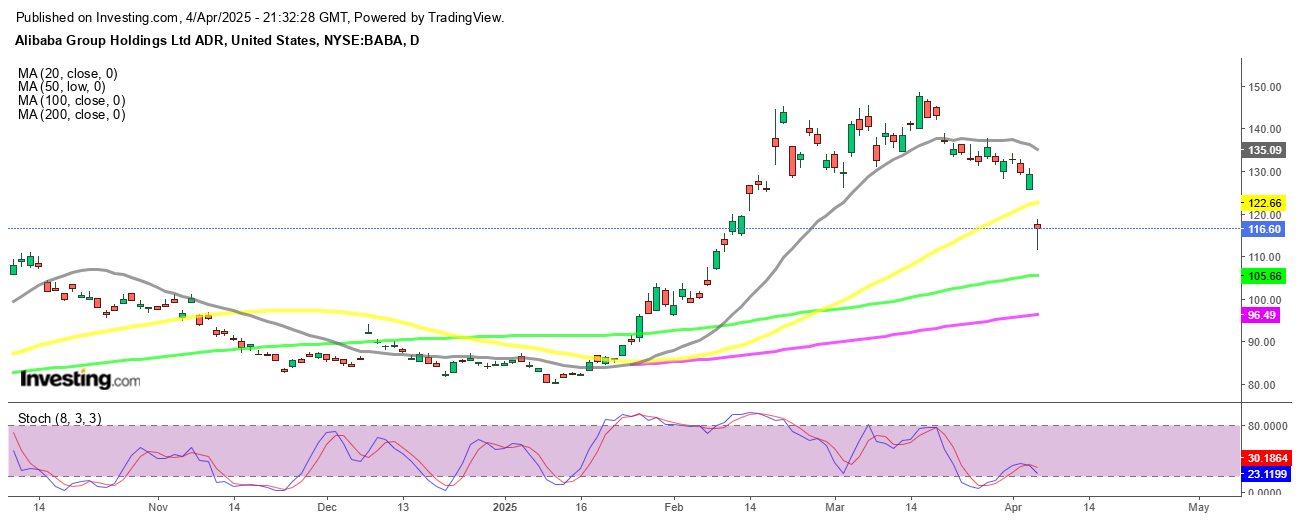 Alibaba (BABA) had held up relatively well in recent sessions, even as global tech stocks faltered. That changed on Friday. The stock gapped down at the open, falling as much as 14% intraday before closing 10% lower, dragged down by concerns over U.S.-China trade friction and renewed regulatory fears.