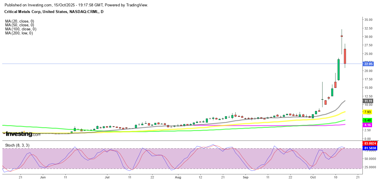 After weeks of record gains, Critical Metals’ stock tumbled on Wednesday, losing over 25% intraday and briefly touching $20 before stabilizing. The selloff likely reflected profit-taking after the parabolic rise, as traders locked in gains amid uncertainty about trade developments and valuation concerns.