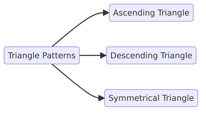 - Triangle Patterns: Characterized by converging trend lines that form a triangle shape, signaling a consolidation phase before a potential breakout. They come in three types: