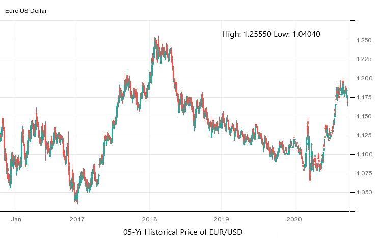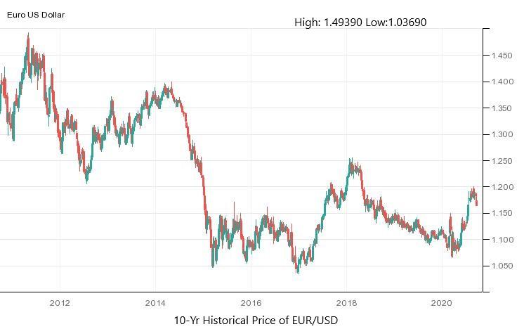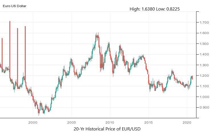 The Euro currency has been adopted by 19 EU member states as their national currency. There are many factors that affect the price of the EUR, including the political and economic conditions of EU member states. The prices of the EUR/USD currency pair are affected by several economic data releases and other news related to the two individual currencies. The EUR/USD exchange rate is also considered a riskier currency pair, and the factors affecting the risk-on market sentiment can affect the prices of the EUR/USD pair too. Important to note that the EUR to USD historical has indicated the relationship between the EUR/USD exchange rate and risk-on market sentiment is positive or direct, which means that a rise in one causes a rise in the other and vice versa. Below we are going to evaluate some Euro historical charts as well as the relationship to the USD, so as to gain a pick of whats been happening in the pair’s market.