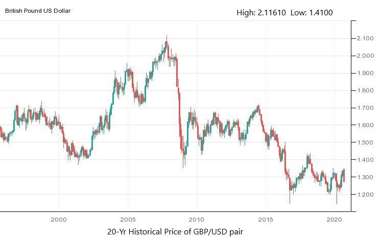 The British Pound hit a seven-year low level after the global economic recession, also known as the Great Recession in 2009, a significant time in GBP/USD history. The GBP/USD pair was recorded as $1.40 at that time. In 2016, the GBP/USD pair fell to its lowest level since 1985 after the U.K. held a referendum that decided that Great Britain would put out of the European Union by March 2019. Overall, the GBP/USD pair dropped by 8% on that day, which was the biggest single-day decline in the currency pair since the Bretton Woods System in 1971. Below, let’s look at some GBP to USD historical charts and graphs to understand the journey of the pair.