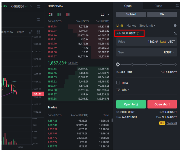 2. If you need to move money into your Futures account, tap the arrows in the trading ticket on the right of the trading terminal, then transfer money from your Spot account to your Futures account.