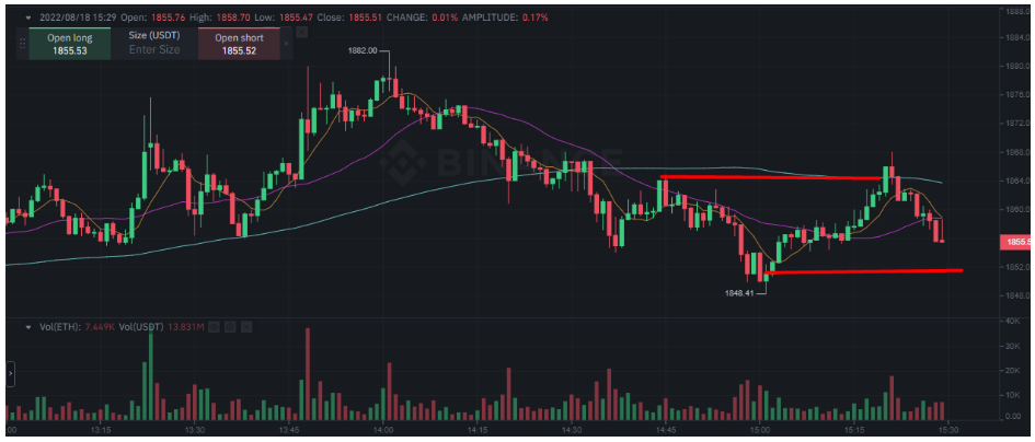5. You’re ready to start finding setups to trade! For example, let’s look at what’s happening here on the 1m. We’ve seen prices break to form new highs, so we can guess we might be bullish. We want the best possible risk to reward, so we’re going to place a trade at the bottom with a stop just below.