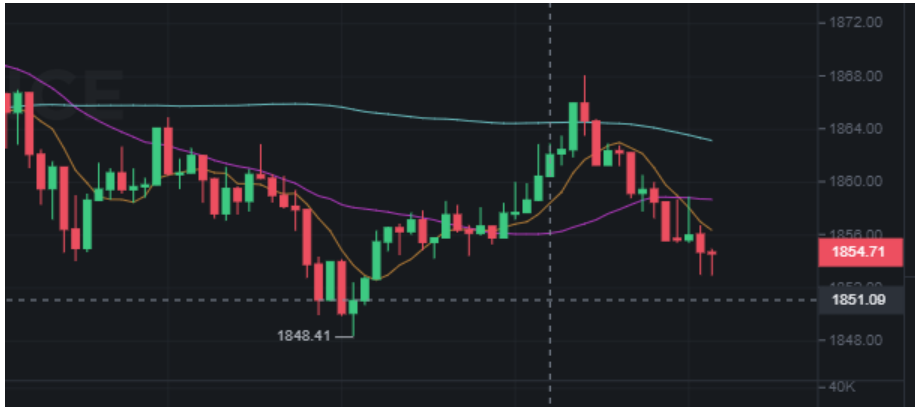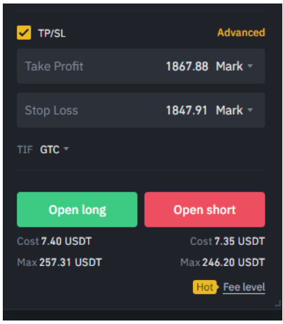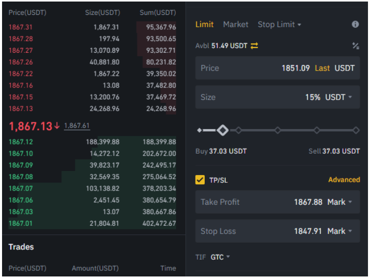 8. Now, put in your price from earlier under Limit. If you want to enter right away, use Market. In our case, we want to enter at $1851.09. We also need to set our take profit target and stop loss. We’ll use the high that formed the uptrend as a profit target and the low as our stop.