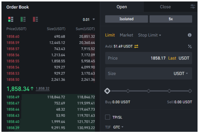 7. Head over to the trading ticket on the right-hand side. Set your leverage, and make sure it’s set to isolated. This will keep your margin to that specific trade, and is less risky than cross margin, which combines margin if you have multiple positions open. Lower leverage is always more prudent when trading crypto, so we’d recommend a maximum of 5x.