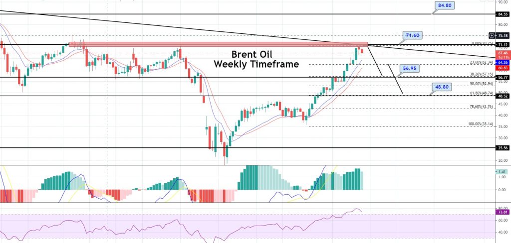 On the weekly time-frame, Brent Oil has closed a Doji pattern below $71.60 resistance, and at the same time, the MACD and RSI are also hitting the overbought zone. Technically this means the bulls are exhausted, and they may start profit-taking in the overbought Brent Oil. That being said, Brent prices may drop until the $62.34 (23.6% Fibo) level at first, and later the violation of the $62.34 level can lead Brend price towards the next support area of $56.95, a level that marks 38.2% Fibonacci retracement. If Brent Oil fundamental continues to pressure the oil market, we may see further drop in until 61.8% Fibonacci retracement level of $48.80. However, UK oil may continue to trade bullish on the breakout of $71.60 level to target next resistance around $84.80. Good luck!