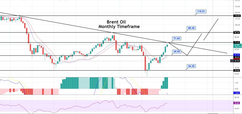 On the technical front, the bulls dominate Brent Oil demand as it trades at the $67.44 level, and the leading technical indicator, the MACD (Moving average convergence divergence), is exhibiting a bullish trend in the Brent Oil. On the monthly time-frame, the MACD and RSI have crossed over the mid-level (0 level), and 50 respectively, which exhibits a strong bullish trend in the U.K. Oil price. Brent has closed a series of bullish engulfing candles on the monthly time-frame typically known as three white soldiers. These kinds of patterns usually drive strong bullish movements; however, Brent Oil is now facing a resistance at $71.60 level.