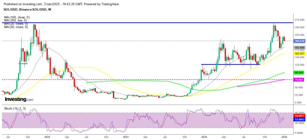 The massive gains after the 2021 surge couldn’t be sustained and SOL coin retreated lower during 2022, falling to $20-$30, where it consolidated for most of 2023. The crypto market went through another bullish wave in Q4 of 2023, which sent Bitcoin to a new record high, while Solana surged to $120. This level turned into support throughout 2024, ignoring the SEC lawsuit, which was a sign of a positive outcome. However, it retreated below $100 in December where SOL/USD closed in 2023.