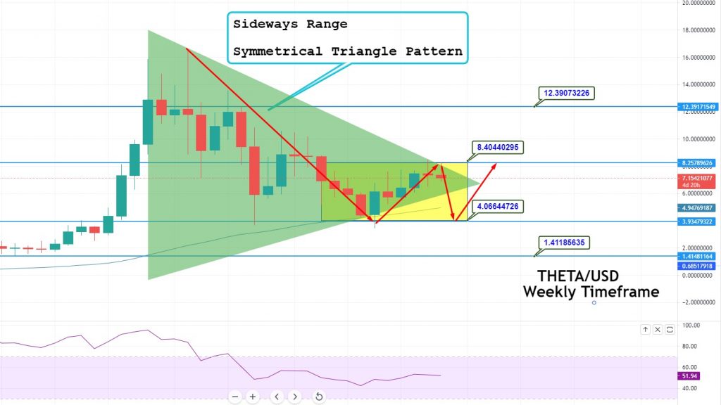 The THETA/USD coin is consolidating in a narrow trading range of 8.40-4.06 level. On the weekly timeframe, the THETA/USD has formed a symmetrical triangle pattern that’s extending resistance at the 8.40 level while the support lingers around 4.06. On the higher side, a bullish breakout of the 8.40 level could lead the THETA coin towards the next resistance levels of 10 and 12.40.