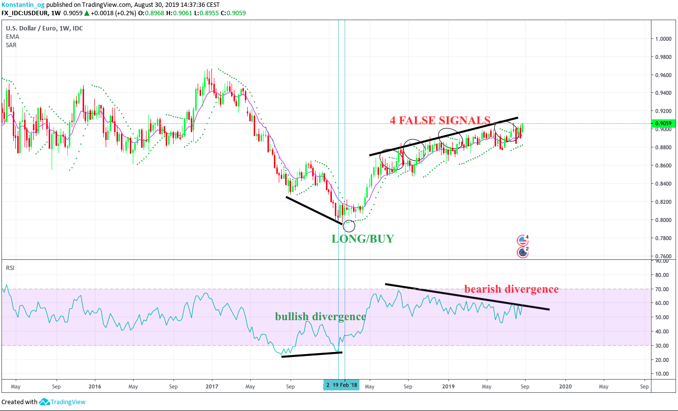 When the RSI showed a bullish divergence in oversold regions, the SAR indicator shifted from bearish to bullish shortly after. Then, the trend went up for a continuous period. While the SAR indicator gave us four false signals during this period, the RSI was losing strength and showed an ongoing bearish divergence. However, as the RSI didn’t touch overbought regions yet, traders could wait for that in addition to a shift of the parabolic SAR indicator to exit the long position. Having said that, the ongoing bearish divergences hints that a sell-off might be around the corner, as the RSI is losing strength and yet the price still tends to climb higher. Thus, the 4 false signals could also hint us towards an upcoming decline in price.