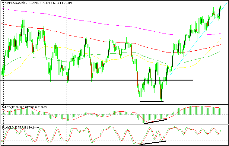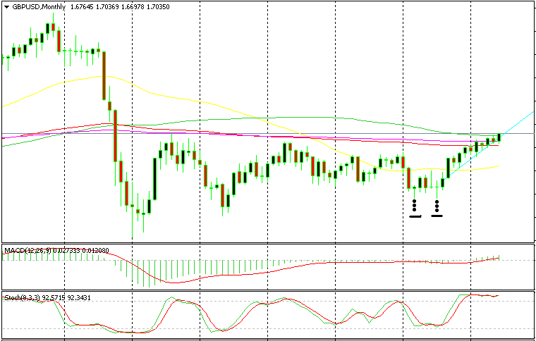 The most daring traders aim to catch trends early. To do so, they have to anticipate price action before it becomes defined. We can see on the GBP/USD monthly chart below that the pair has been trading in a tight range after a downtrend. There are two monthly pin candles that show that there is strong buying pressure around 1.48-49 level. In addition, there is divergence on all three indicators, MACD, Stochastics, and RSI. These elements all serve as confirmation that a new trend is forming.