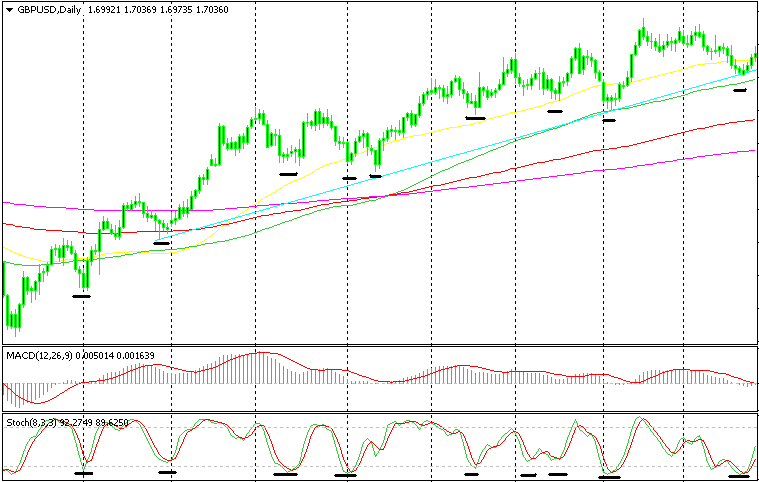 - In and Out – This strategy is for the risk-moderate traders who like to raise the risk a bit in exchange for more profit. ‘In and Out’ strategy consists of placing trades based on the main trend but with smaller time frame chart analysis. Traders who choose to use this strategy take positions during the retraces on the smaller time frame charts when indicators show the pair is oversold and unload them when the same chart shows it has reached overbought levels, indicating another retrace is due. The daily chart below shows the levels to get in. Learn more about using multiple time frames