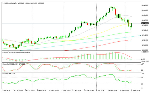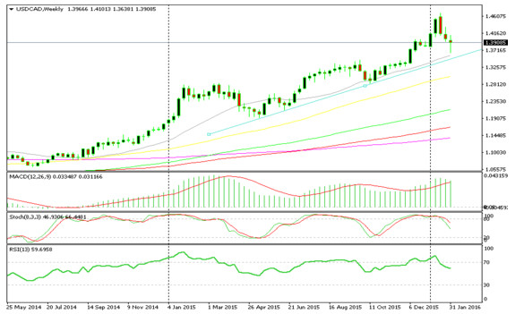 The petrol price has been declining for over a year and so has the Canadian Dollar, meaning that USD/CAD has been moving up in a strong uptrend, reaching 1.47. But since the petrol bottomed out on February 20th at 28$/barrel, at least for the short-term, USD/CAD has made a ferocious retrace of more than 1,000 pips in 12 trading days. As we can see on the weekly chart, the price got close to the 20 MA as the price backed off from it and closed the week nearly 300 pips higher. The price made a hammer on Thursday, as we can see from the daily chart, which is a reversal signal and moved 150 pips higher on Friday. It is now right at the 50 MA in yellow which is the first resistance; next comes the 20 MA about 300 pips higher. But, the petrol price is going to be the driver for this pair.