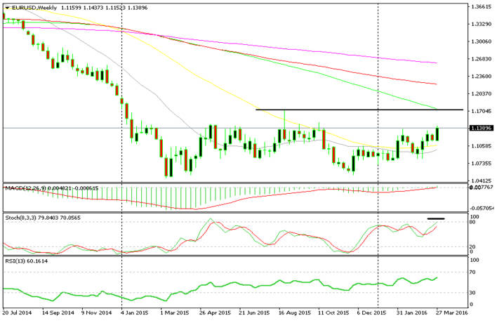 March has been a very good month for EUR/USD, because of both the Euro strength and US Dollar weakness. This pair made the most monthly gains in about five years. Right now, the price is around 1.1400-1.1450 level, near the 20 MA in the monthly chart, which is a strong resistance level as well. There´s still some more room for the stochastic and RSI to reach overbought levels, but the price needs to break above this resistance so the bulls can feel confident. On the weekly chart, the stochastic indicator is nearly overbought but the RSI is not. However, we won´t rule out further gains until the 100 MA that settles around 1.1720-30 which is the high from last August. Personally, I favor the bears at these levels and see the upside as very limited.