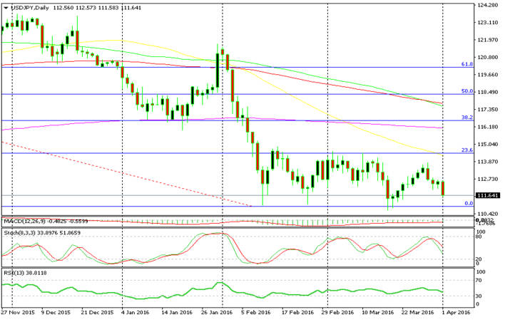 While this was the best month for the Euro against the USD, February was the best month for the Japanese Yen since 1998. This month, the price kept bouncing up and down between 114.50 and 111. It briefly broke below 111 level but the break was short-lived and the price reversed back up entering the 350 pip range once more. So, the monthly candle closed as a doji, which is a sign of trend reversal. The stochastic indicator on the monthly chart is also oversold which is another sign of a possible reversal. On the daily chart, we can see that the 111 level has been a strong support these last two months, while the 23.6 Fibo level has provided resistance. If a reverse is to materialize this fibo level will be clearly broken.