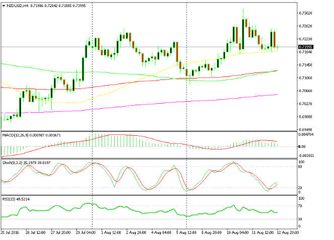 As you can see on the H4 forex chart below, NZD/USD has been in an uptrend in the last three weeks, but last Friday it retraced 230 pips down after the impressive US employment report. The 100 smooth and simple moving averages provided support in early Monday trading which brought an end to this retrace. The uptrend resumed again and the price has moved above the 50 moving average in yellow, which has now turned into support.