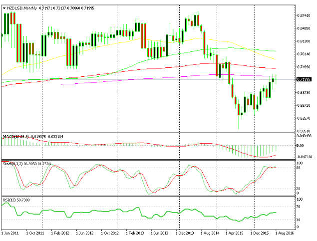 The big bullish candle by mid-week was the surge that followed the RBNZ rate cut. On the monthly chart, we see the long-term downtrend which started in 2014 and the retrace up that has taken place for almost a year now. The retrace seems exhausted now as the stochastic indicator is overbought and the price is right below the 200 moving average which has provided support before and will likely turn into resistance. But, the yield hunting has to come to an end in order for the downtrend to resume its course again.