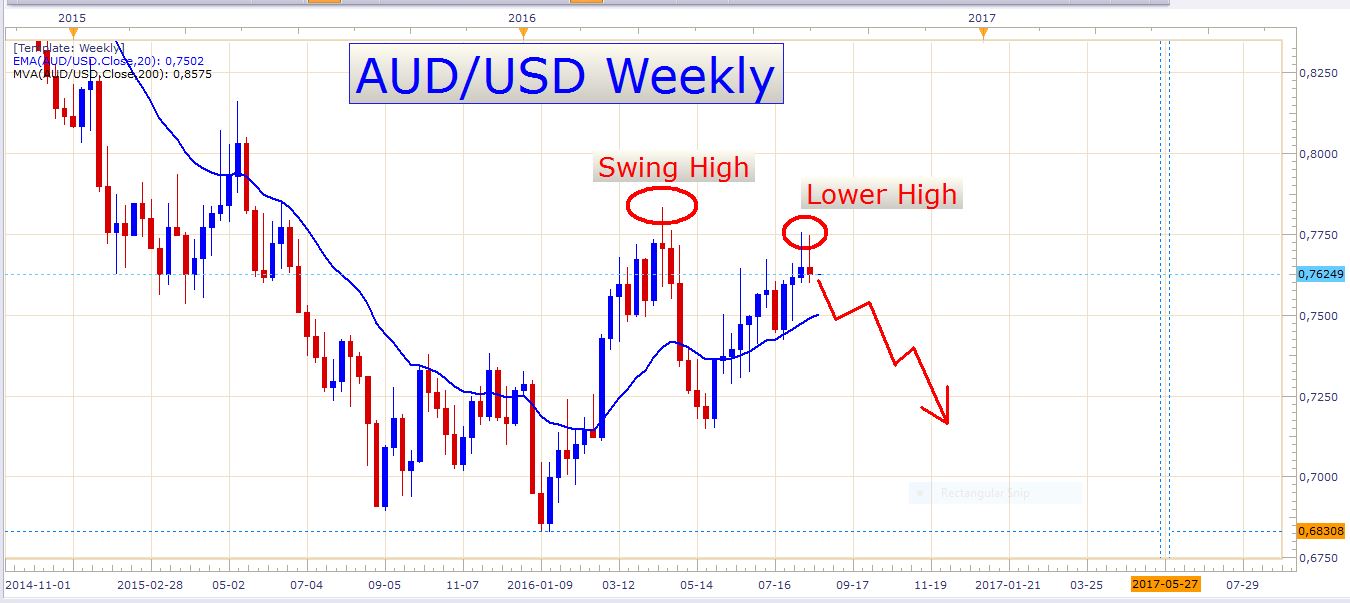 This looks like a splendid opportunity to sell the Aussie. Notice how the black trend line is acting as important resistance to the price. What I like about this setup is that we have two pin bar candles next to each other forming a tweezer top which is also a type of a double top formation. This indicates a high probability of a price reversal. Especially because these two candles rejected off of such an important price level. The fact that last week printed a red candle also strengthens the bearish bias on this pair. Furthermore, we see that a lower high has been formed which tells us that the bullish momentum has been halted, at least for now. Look at the chart below:
