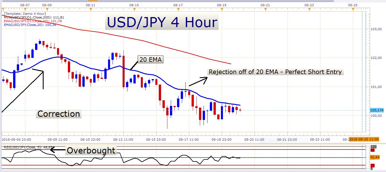 Would I enter a short position at the current price? Not necessarily, but perhaps there might be some juicy setups on smaller timeframes during the week. Perhaps a pullback to the 20 EMA on a 4-hour chart preceded by an aggressive decline. Look at the example on a 4-hour chart: