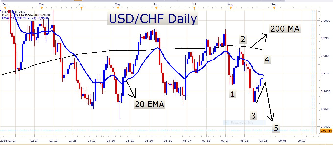 I am still holding on to my short positions on this pair. Today was the fourth day on which price failed to close above the 20 EMA, with yet another candle shadow piercing this exponential moving average and rejecting off of it. This strengthens my bearish bias on this pair and I still expect some further downside over the next few days. Look at the daily chart below and notice the last four candle wicks (candle shadows) that pierced the 20 EMA: