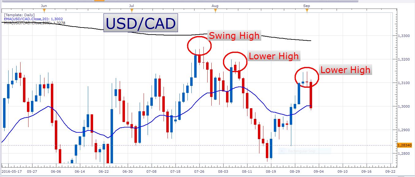 On Friday we saw the oil price pick up somewhat. This also helped the Canadian dollar on the day. What I like about being short the USD/CAD is that we had a firm close below the 20 EMA on Friday. I am always more comfortable when the price is below this exponential moving average when I’m in a short position. This tells us that the short term momentum is bearish and that more downside could be on the horizon. To give you a bit more perspective, this pair is trading well below its 200-day moving average which tells us that this pair is considered by the investment world to be in a downtrend. Something else to keep in mind is the fact that the recent swing high is indeed a lower high, with two recent swing highs preceding it. Look at the chart below: