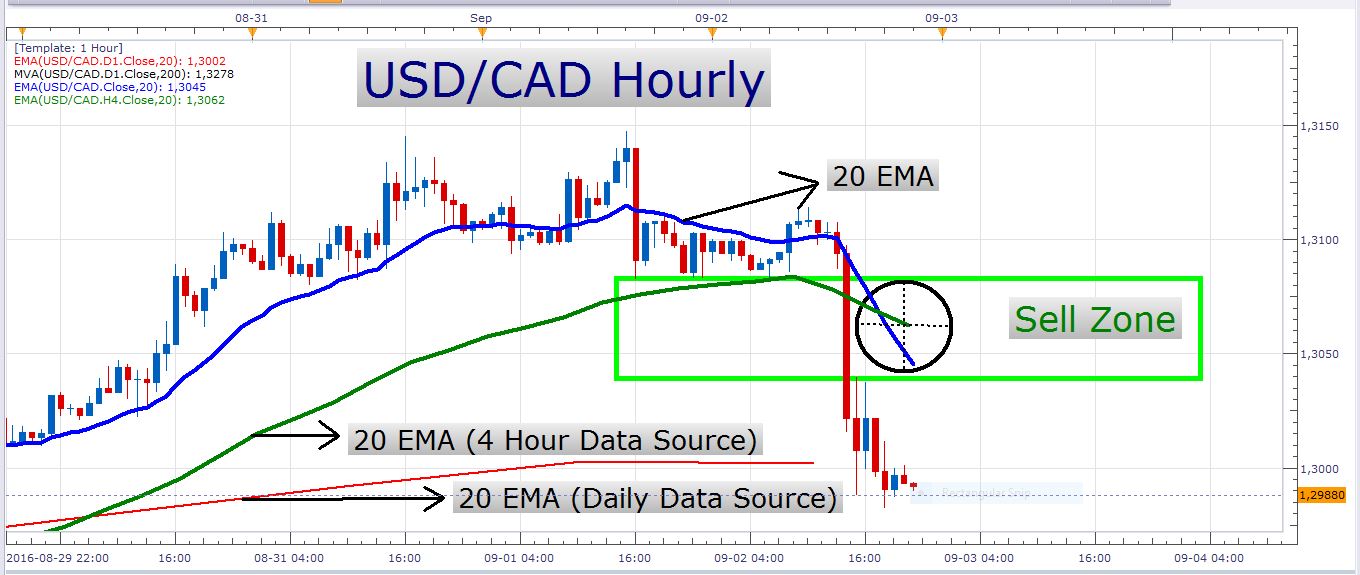 Now perhaps you are wondering how you can take advantage of this recent Canadian dollar strength. You can, of course, take entries off the daily chart, but another way to play it is on an hourly chart by waiting for a retracement. As you may know by now, I like taking entries close to the 20 EMA on an hourly chart. This keeps me from chasing the price and provides me with a much higher probability trade setup. Price chasers are often disappointed when the price pulls back soon after they’ve entered a trade. They need to use much wider stops which greatly reduces their chances of being profitable. Let’s look at an hourly chart of the USD/CAD: