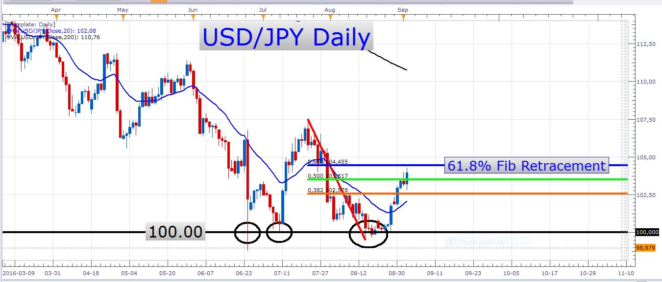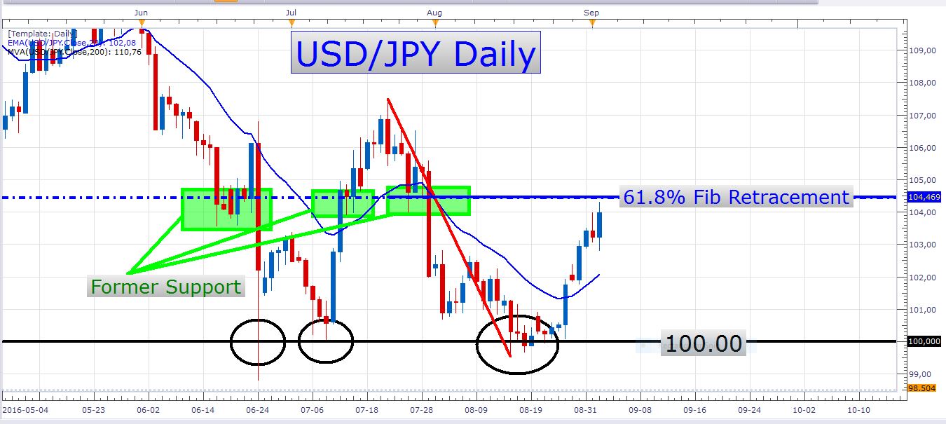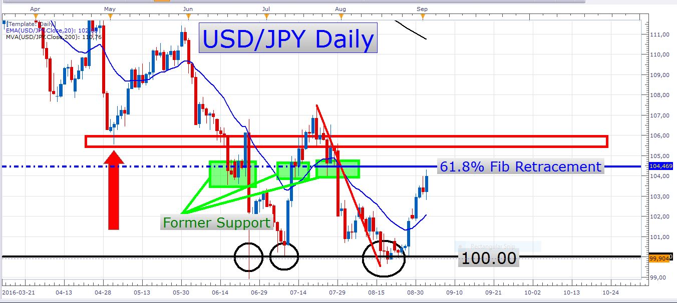 This pair has been one of the most interesting to watch lately. The big 100 psychological level has been rock solid support, and the price has deflected off of it several times since the 24th of June. I personally thought that this level would eventually fold, and perhaps it will, but at the moment the price is allergic to this level and trading far from it. Let’s look at a daily chart: