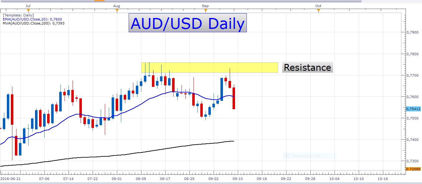 In Thursday’s article, I mentioned that I would have liked to see the AUD/USD trade below the 20-day exponential moving average again and that this would keep me excited about playing this pair on the short side. Today the pair closed convincingly below this exponential moving average, and I’m smiling because I’m still holding on to my short positions which I opened on the 22nd and 23rd of August. Let’s look at daily chart: