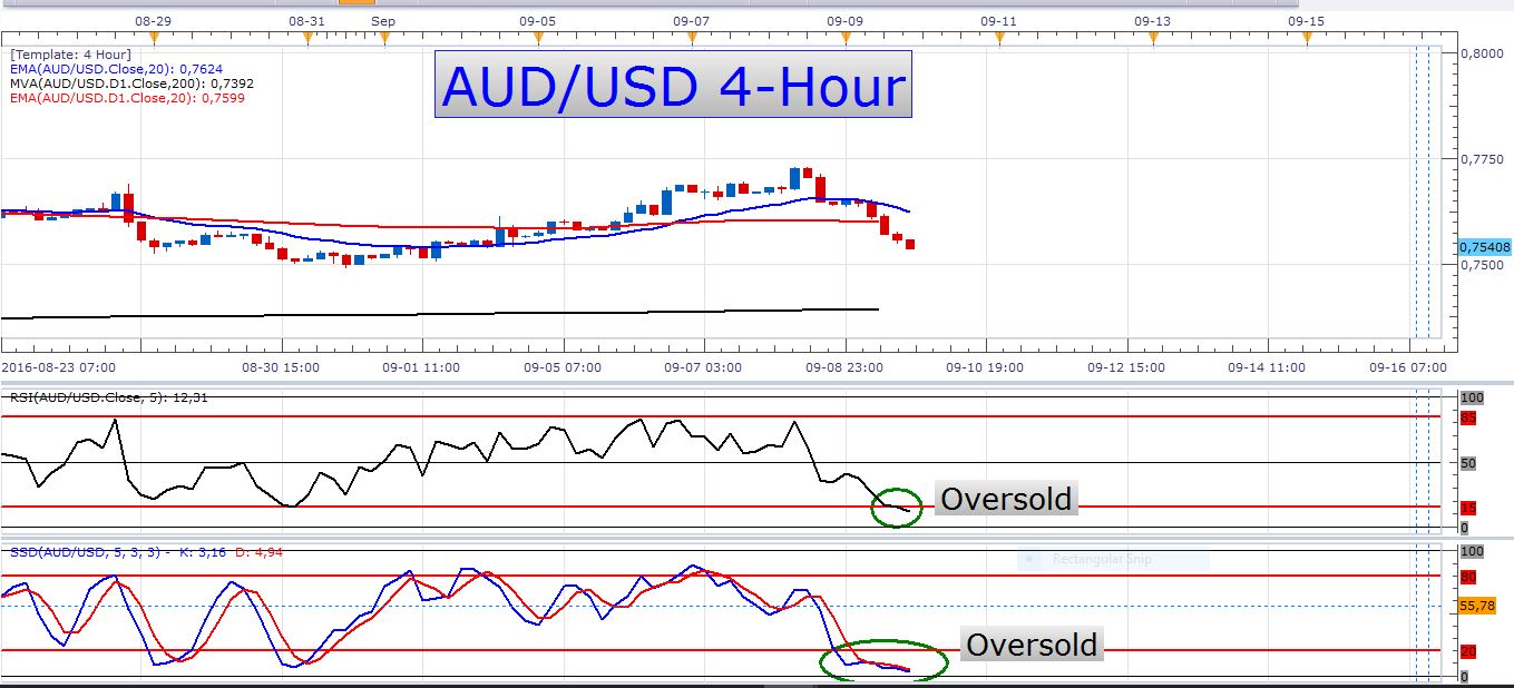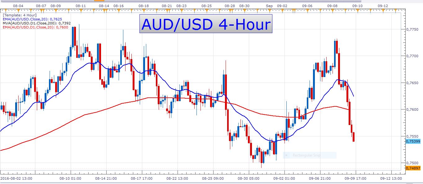 Traders who are seeking short entries on the AUD/USD may wait for retracements to, for example, the 20 EMA on an hourly chart. This exponential moving average can also be used on many other timeframes which include the 4-hour, daily, and weekly charts.