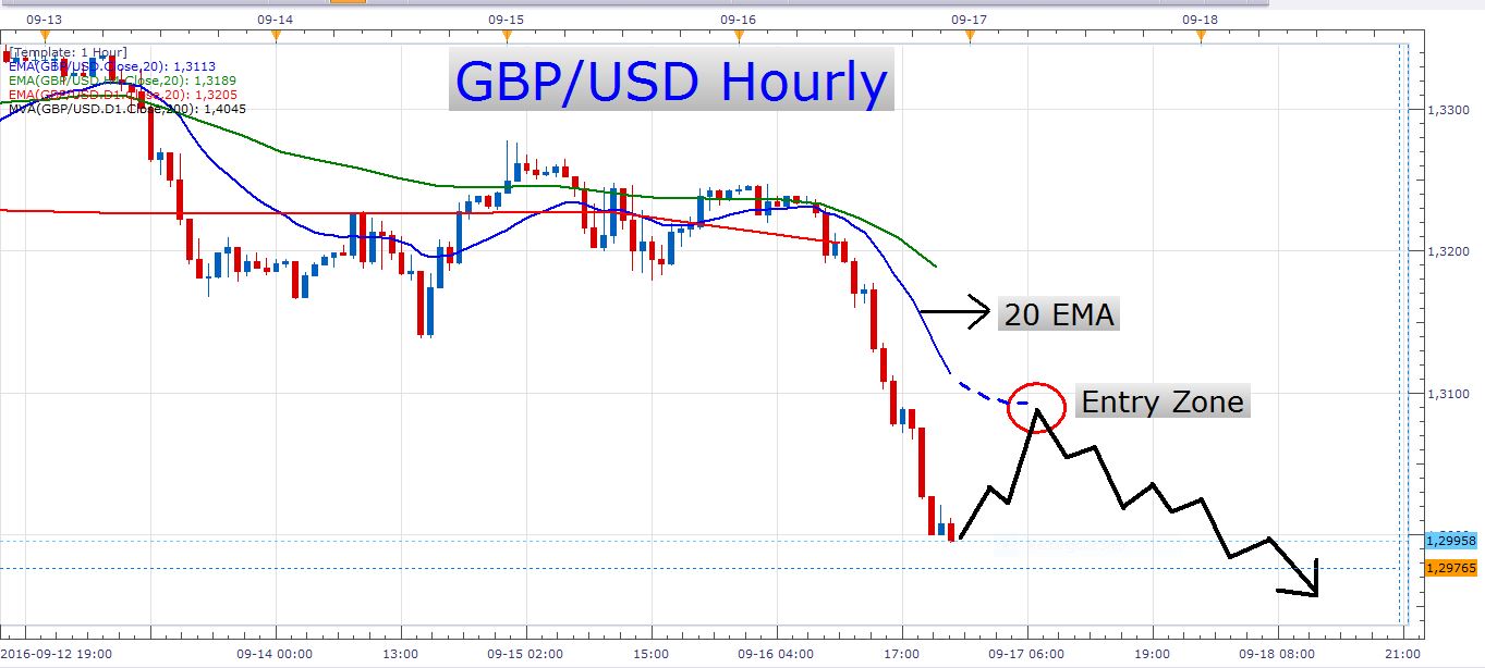 So how can we trade this pair tomorrow? Friday’s decline was pretty severe, and at the moment oscillating indicators are giving us oversold readings, especially on shorter timeframes. This makes me cautious of entering a short position at the current price. I would prefer to wait for a reasonable pullback to take place first, and then see if we get some impulsive selling again. If we get a pullback to the 20 EMA on an hourly chart, for example, I would keep an eye on how the price reacts to it. If I see some renewed selling pressure step in, I will initiate new short positions. Look at this chart: