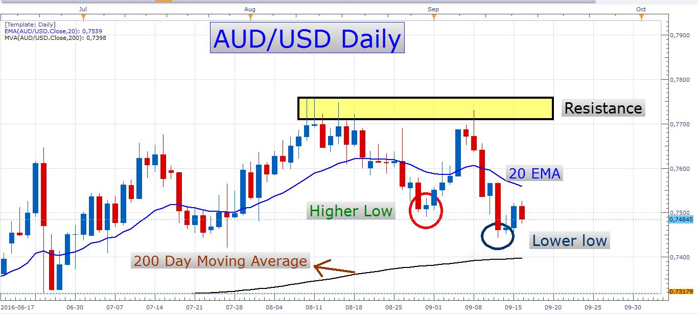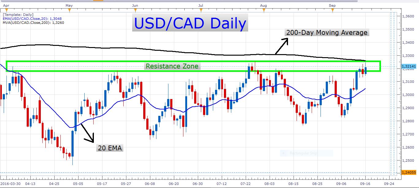 This pair is trading at an important resistance zone at the moment. Although it might be a difficult zone to overcome, the FOMC meeting this week, and Janet Yellen’s speech might be just the right fundamental catalysts to drive the exchange rate through this zone. The 200-day moving average is right at this resistance zone and greatly adds to the importance of it. Look at the following chart: