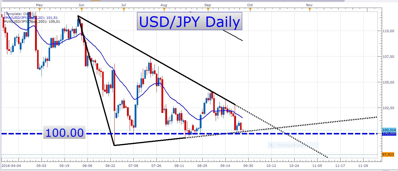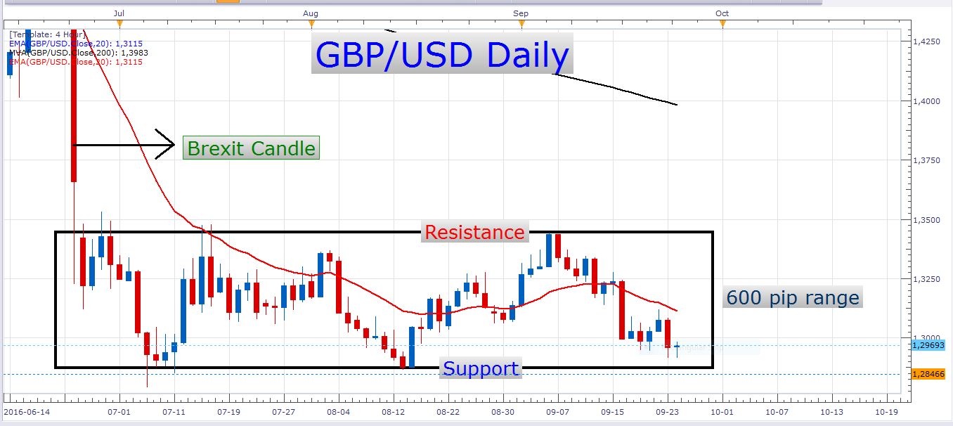 The British pound has really taken a beating lately. For more than two years the pound has been declining against the US dollar. When the Brexit was confirmed the pair declined more than 1100 pips on the day, and after that, the pair traded lower some more to where it is now, at 1.29700. With all the great fundamental catalysts that have influenced the pound lately, it is somewhat strange that the pair has been in a consolidation phase for the last 65 trading days. Look at this daily chart: