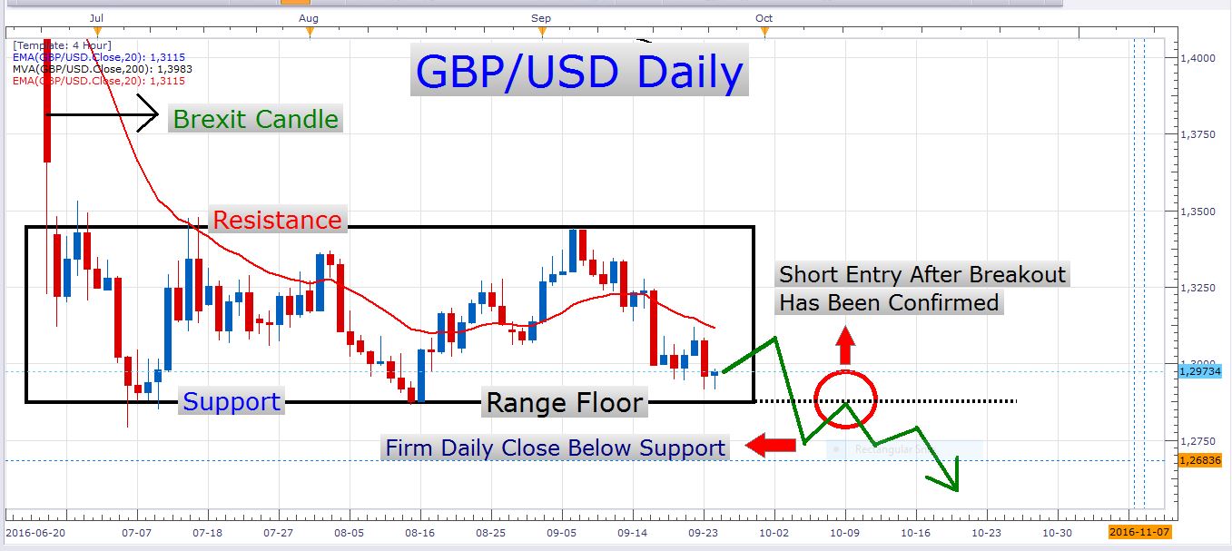 So let’s say the pair breaks out lower sometime soon. The confirmation would be a solid daily close below the range floor. Some traders like to enter trades when the actual breakouts occur. This has its advantages, but sometimes it is wiser to wait for a retracement to take place after the breakout has occurred, before entering a trade.