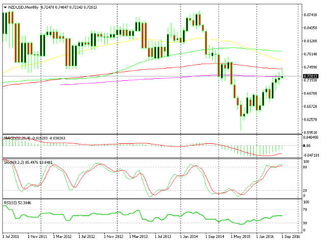Looking at the daily chart, we can see the uptrend in NZD/USD. It hasn´t been a very strong update but it has been consistent. In the last two months, the 50 MA in yellow has done a good job providing support on dips. The monthly forex chart paints a different picture, it shows us that the long-term trend is down and the recent uptrend in the daily chart is just a retrace of the long-term downtrend. The stochastic indicator has reached overbought levels and the 100 and 200 smooth MAs are providing solid resistance in this timeframe chart. This means that the uptrend might have come close to an end and the next leg of the downtrend is bound to follow. The weekly forex chart is telling us the same thing as well, so maybe it is time to open a long-term sell forex signal here.