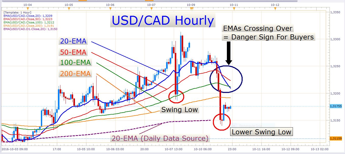 Can you see the structural transition that occurred here? At first, the EMAs (exponential moving averages) were aligned with one another, and the pair was printing higher highs and higher lows. Then we had today’s massive decline. Now the 20-EMA has started to cross over the 50-EMA and the 100-EMA. Besides this, a lower swing low has been set in place which is the last thing a prospective buyer wants to see on a chart (except in some cases where the end of a three wave correction signals the start of a new bull run in Elliot Wave Theory).