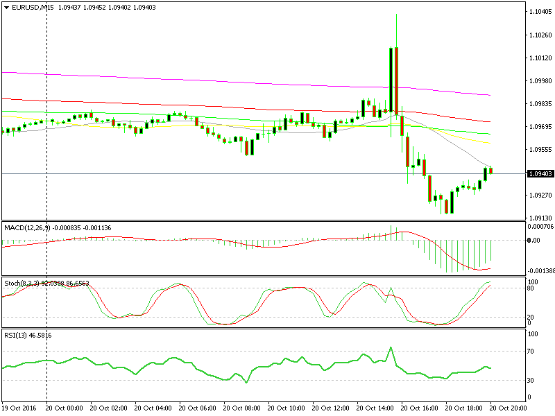 The market got excited at first about a possible tapering process and the Euro surged 60 pips higher. But then, a few minutes later the sentiment shifted after Draghi denied that the ECB had decided anything, in either direction, and the big reverse started.