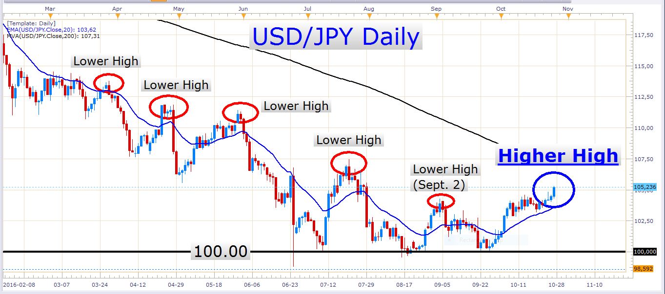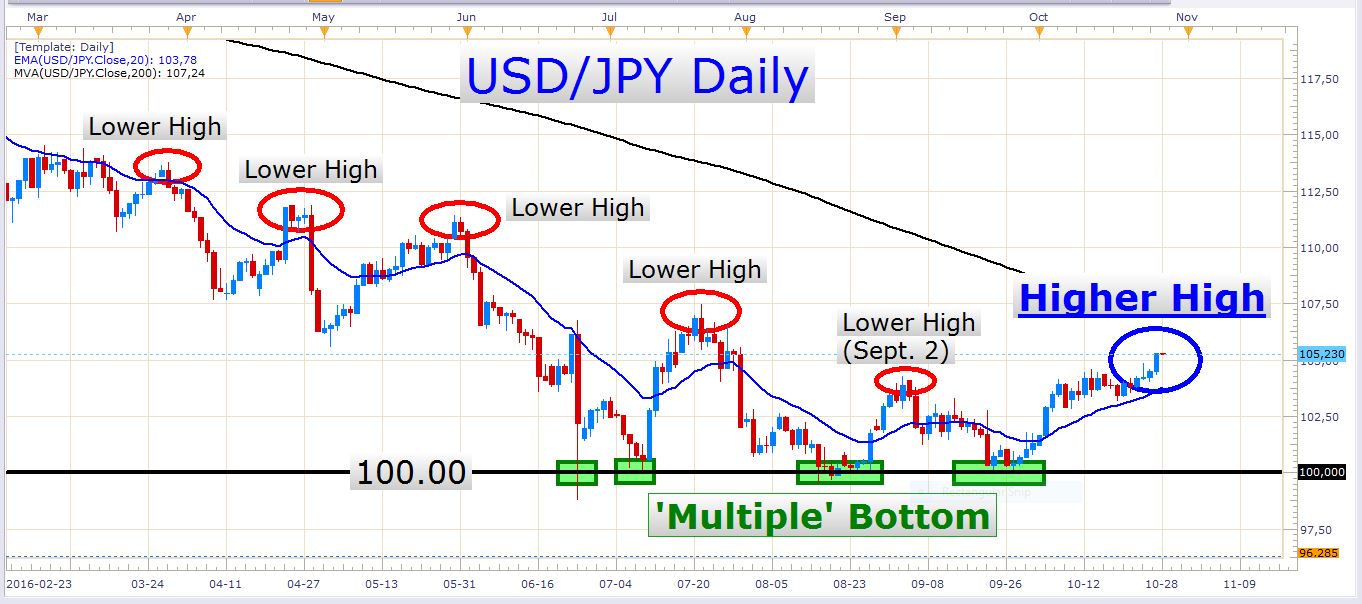 The blue circle marks the higher high that was formed. The formation of higher highs and higher lows are crucial characteristics of an uptrend. Conversely, the formation of lower highs and lower lows are crucial for a downtrend. The wave formation of a trend is a very important factor which professional traders analyze when they make trading decisions. The technical picture of the USD/JPY has undergone a very important structural shift. Not only has a higher swing high been formed on the daily chart, but also a triple bottom in the region of the big psychological 100.00 level. Or perhaps I should rather say that a ‘multiple' bottom has been formed because the price actually touched and rejected off this zone several times. Look at the following chart: