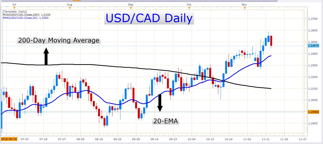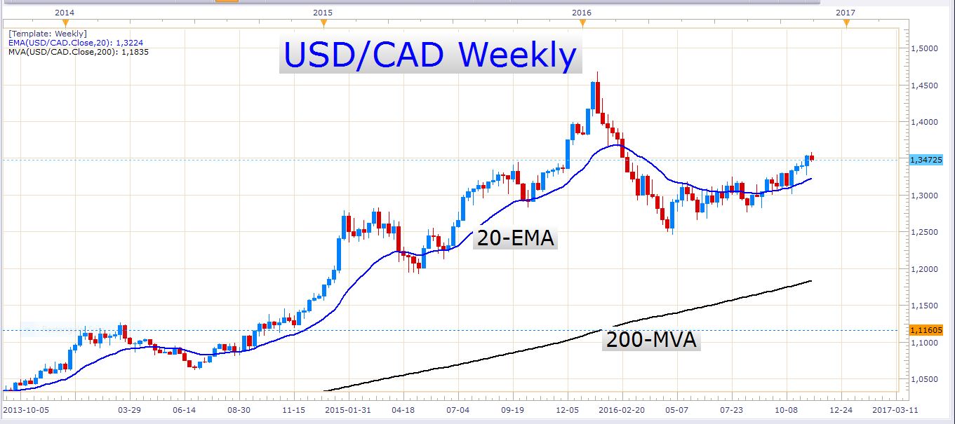 The USD/CAD has recently been a great pair to trade. The technicals are beautifully aligned in the sense that the lower time frames indicate the same trend direction as the higher time frames. For example, the 4-hour chart indicates the same direction as the weekly chart. Look at the following charts: