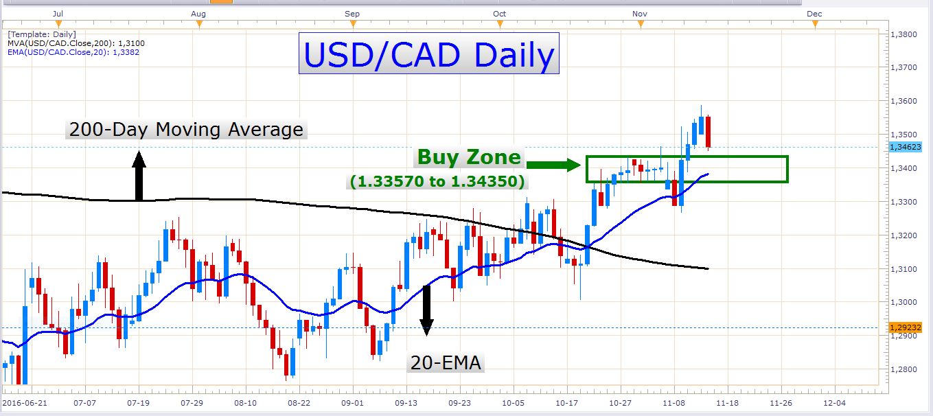 The buy zone I marked on the chart lies between 1.33570 and 1.34350. This level appeals to me because it contains a polarity point where the exchange rate formerly encountered resistance. Remember, that in a healthy uptrend, former resistance zones often turn into zones where support may be found.