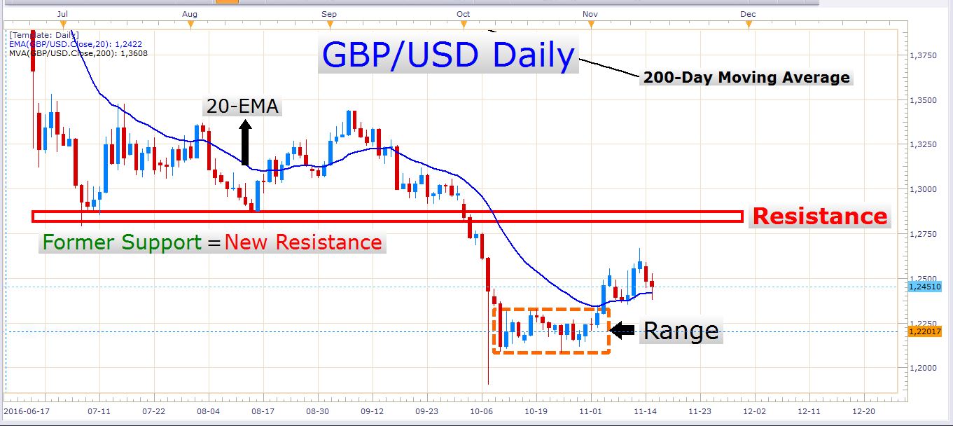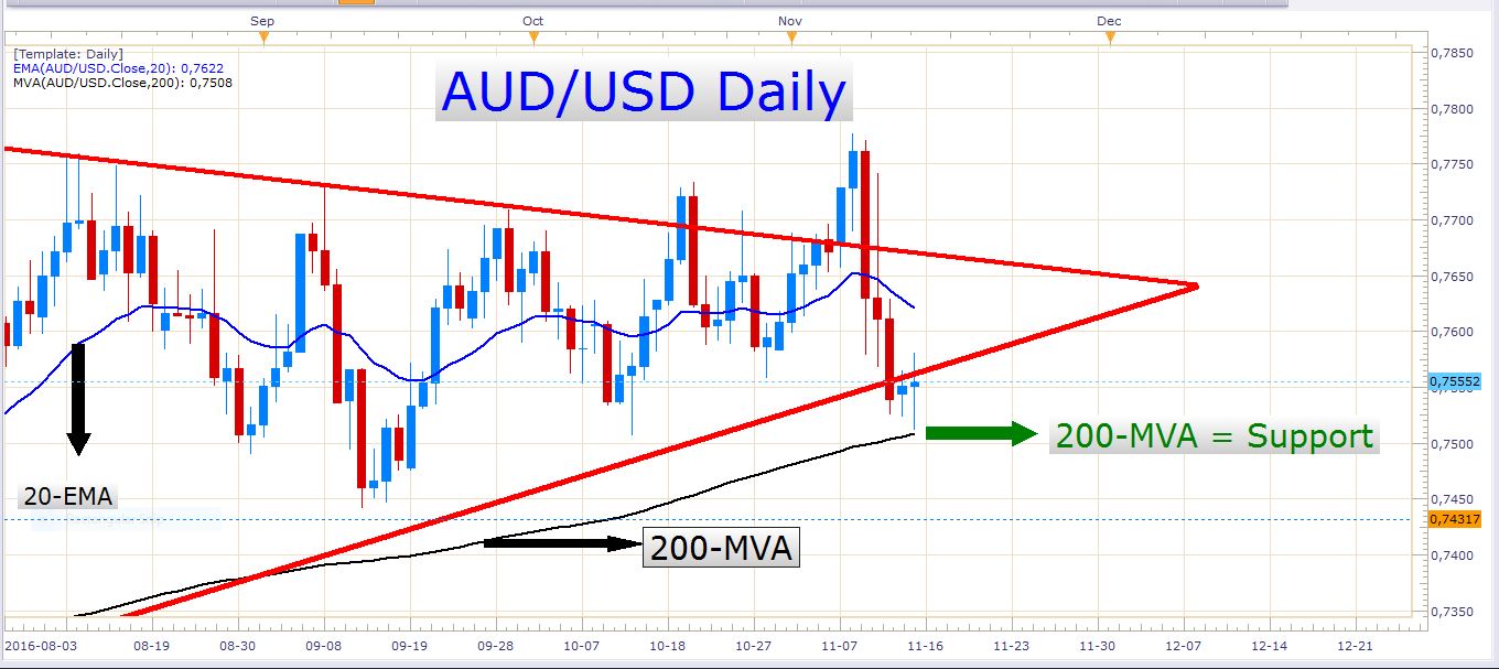 It seems like this pair might find support at the 200-day moving average. The price turned around just above this indicator today. Look at the following chart: