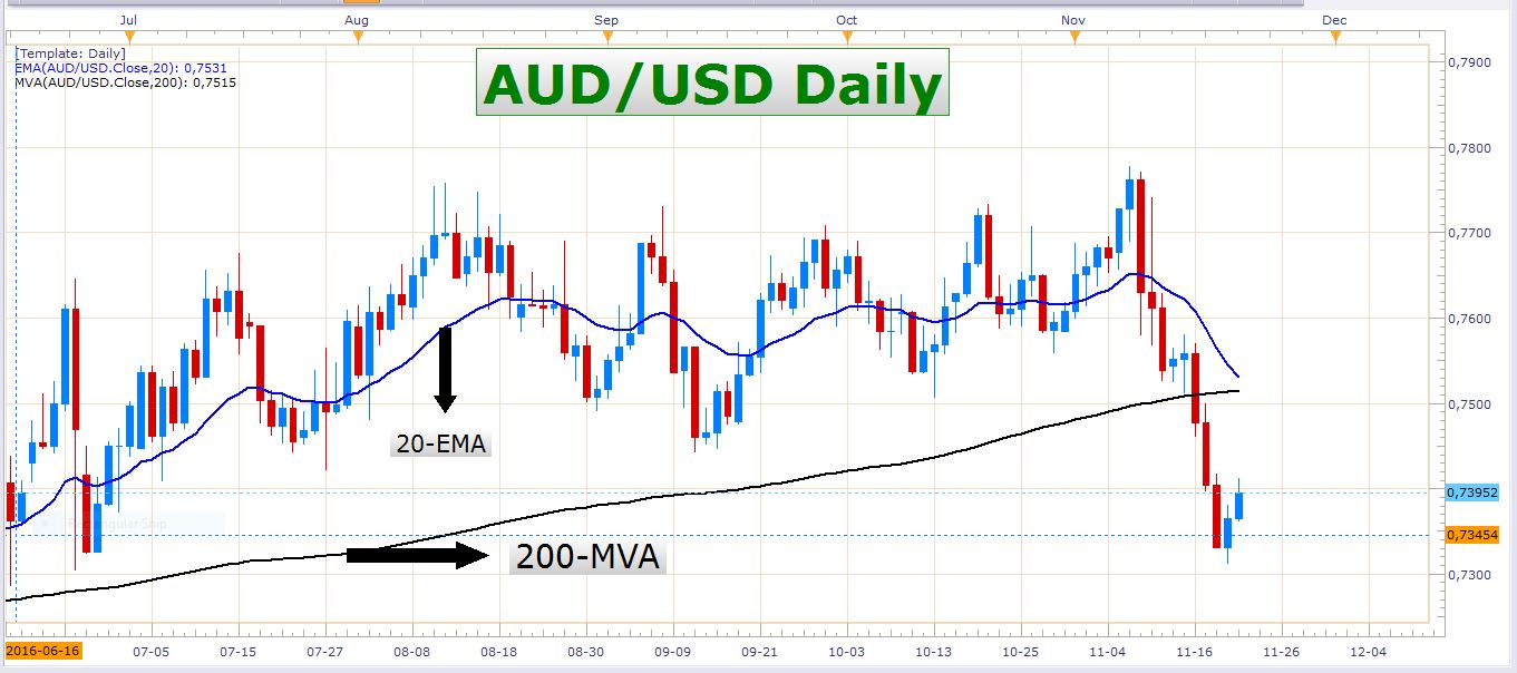 You might have noticed that a short entry near this blue circle would enable you to place a relatively tight stop loss just above the 200-day moving average (the black moving average). It could be helpful to have this moving average between the market price and your stop loss, as the 200-day moving average often acts as a resistance level in a downtrend. From a technical standpoint, the AUD/USD is definitely in a downtrend and therefore we should only be looking for opportunities to sell this pair.