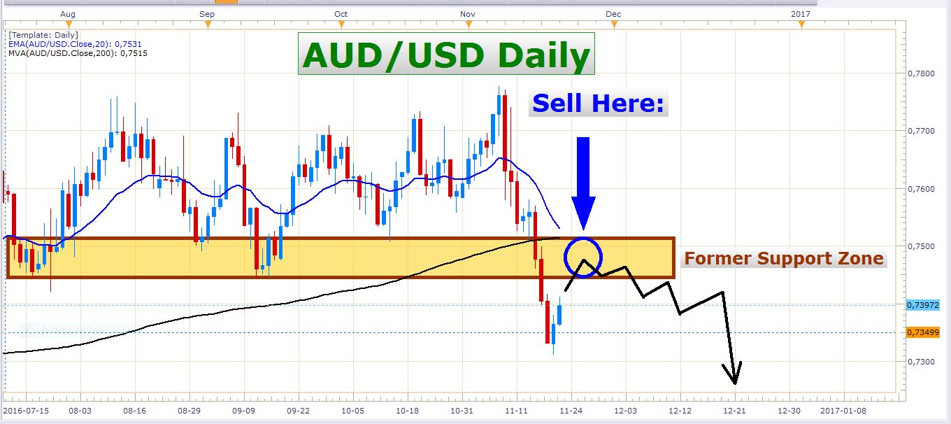I really like the impulsive selling that has driven this pair lower in the last couple of days. Monday and Tuesday’s bullish candles are corrective in nature, and after this correction is over, the AUD/USD will probably decline further. It is possible that this pullback which is forming could continue to push higher until the weekend, or even into next week. This retracement could offer great opportunities to enter short positions on this pair. Traders who would like to short this pair might want to wait for some kind of confirmation before entering the market. Perhaps some impulsive selling on a lower timeframe, or the formation of a daily pinbar candle. The ideal scenario would be if the retracement reached a zone where former support is situated. This previous support zone could turn into a new resistance area. Look at the following chart: