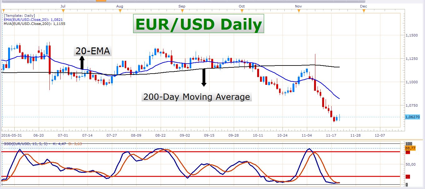 Something else to take note of is that the slow stochastics indicator is in oversold territory and that the K and D lines are busy crossing over. This hints at a possible correction taking place soon. Look at the following chart: