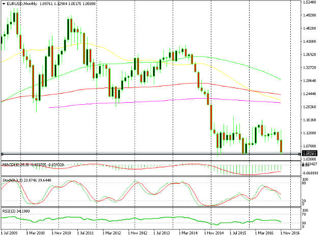 EUR/USD has been trading in this 10 cent range for nearly two years now, but in the last two weeks, the price action has been telling us that something is starting to stir and the 800 pips move top to bottom clearly shows that. Of course, this pair is heading to the downside, but as we can see from the weekly chart the stochastic and REI indicators are already oversold while this week´s candle formed a doji, which is a reversal signal. Besides that, if we look at the monthly forex chart, the same indicators are almost oversold, which means that by the time the month ends (3 days) and considering this month´s massive bearish candle, these indicators will be well oversold.